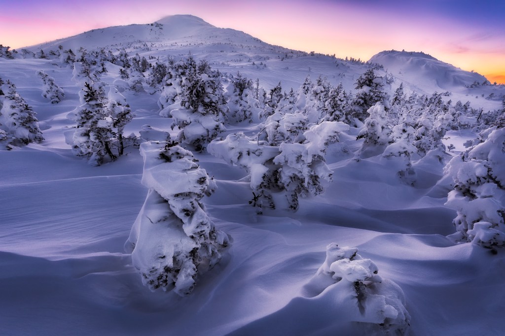 Standing as the highest mountain in New York at an elevation of 5,344 feet, Mount Marcy draws hikers from near and far. There’s just something about being at the highest point in a state that’s alluring, and from the icy winter summit of Marcy, all of the Adirondacks spreads out below your lofty perch. With a round-trip distance of nearly 15 miles coupled with over 3,000 feet of elevation gain, climbing Marcy makes for a long day, and catching the sunset from the summit means that you’ll have several hours of hiking in the dark back to the trailhead to look forward to. For those that have the requisite experience, fitness, and gear, though, it doesn’t get any better than this. After gradually ascending to treeline, the final half-mile push to the summit is on the wide-open and rocky summit block, with no protection from the elements. Once on the summit, a panoramic view of mountains and lakes spreads as far as the eye can see. As the sun sets over the distant horizon, take pride in the fact that no one in the state is higher than you, physically and maybe emotionally too, before readying for the long and dark sojourn home.