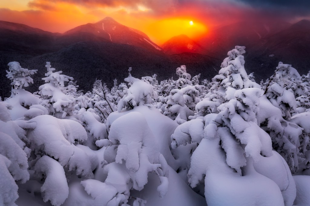 While not one of the tallest or the highest Adirondack High Peaks, Phelps Mountain is my personal favorite Adirondack peak for watching and photographing a winter sunset. Ringing in at a round-trip distance of 8.8 miles with almost 2,000 feet of elevation gain if departing from the Adirondack Loj (parking fee of $15/day, reduced to $7/day for Adirondack Mountain Club members) Phelps is in that sweet spot of providing enough of a challenge to make you feel like you’ve really accomplished something, while being short enough so that you won’t be hiking back in the dark for hours on end. After a quick 2 mile jaunt to Marcy Dam and a little over a mile of gradual climbing along Phelps Brook, a classic steep and rugged Adirondack trail diverges from the Van Hoevenberg Trail to climb 1.2 miles to the summit of Phelps. Two characteristics of Phelps make this peak particularly amenable to winter sunsets. First, although the summit offers expansive views, it’s not completely exposed and hardy evergreen provide protection from the wind and make for interesting photo subjects when they’re caked with snow and ice. Second, Phelps offers wide-open views to the west, meaning that you’ll have a clear vantage point of the sun setting over the lofty summits of Mount Colden and Algonquin Peak, with Mount Marcy catching beautiful sidelight. While views from the summit proper are exceptional, ledges a couple hundred yards shy of the summit might provide an even better vantage point to watch the setting sun cast a warm glow on the snowy landscape