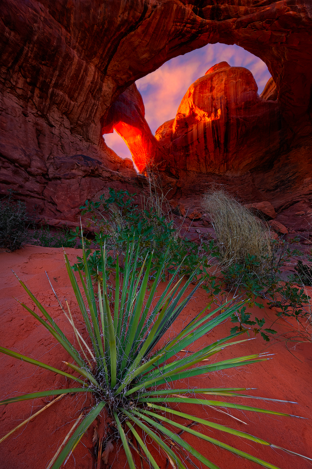 Posted bypriolaphotographyPosted inphoto of the weekTags:april, arches national park, double arch, sand, sunset, utah, yucca plant