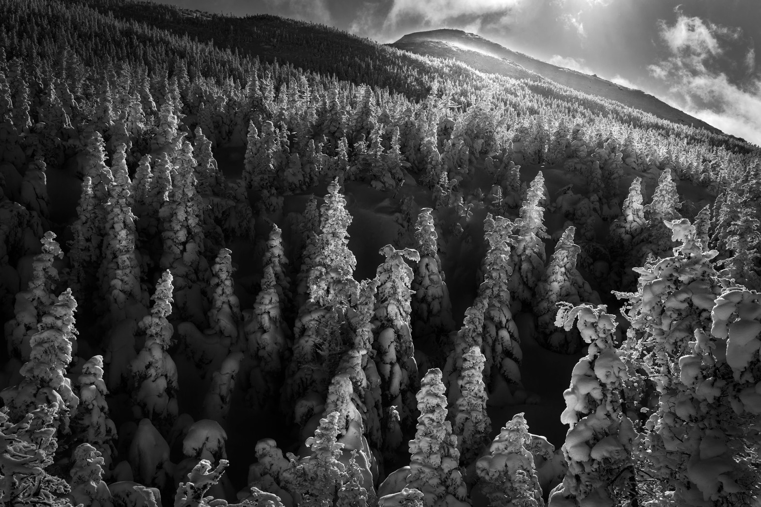 Evening lights shines on snowy krummholz and distant mountains as the valley in between plunges into darkness. Adirondack Mountains, New York. Prints Available.