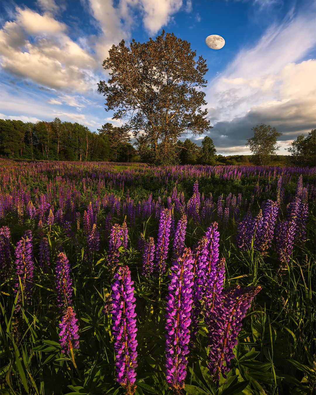 A beautiful field of lupines soaks up the last light of the day in New Hampshire’s White Mountains. A nearly full moon added a special touch to the already serene scene. Prints Available.