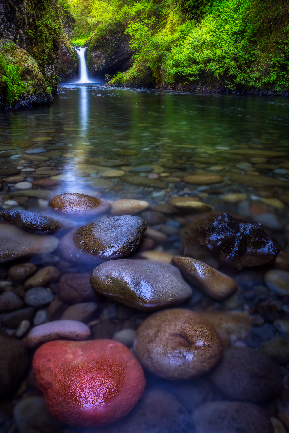 An iconic Pacific Northwest scene of Punchbowl Falls pouring into a rocky grotto lined with vibrant green mosses and ferns. While inspiring landscapes such as this often seem like permanent fixtures, statues sculpted from the most impervious stone imaginable, we are sometimes reminded just how fragile the Earth is. Due to the careless acts of a group of teenagers, who thoughtlessly tossed firecrackers into Eagle Creek Canyon, the Eagle Creek Wildfire of 2017 ravaged the canyon in which Punchbowl Falls resides, and the full impact of the damage remains to be seen. Prints Available.