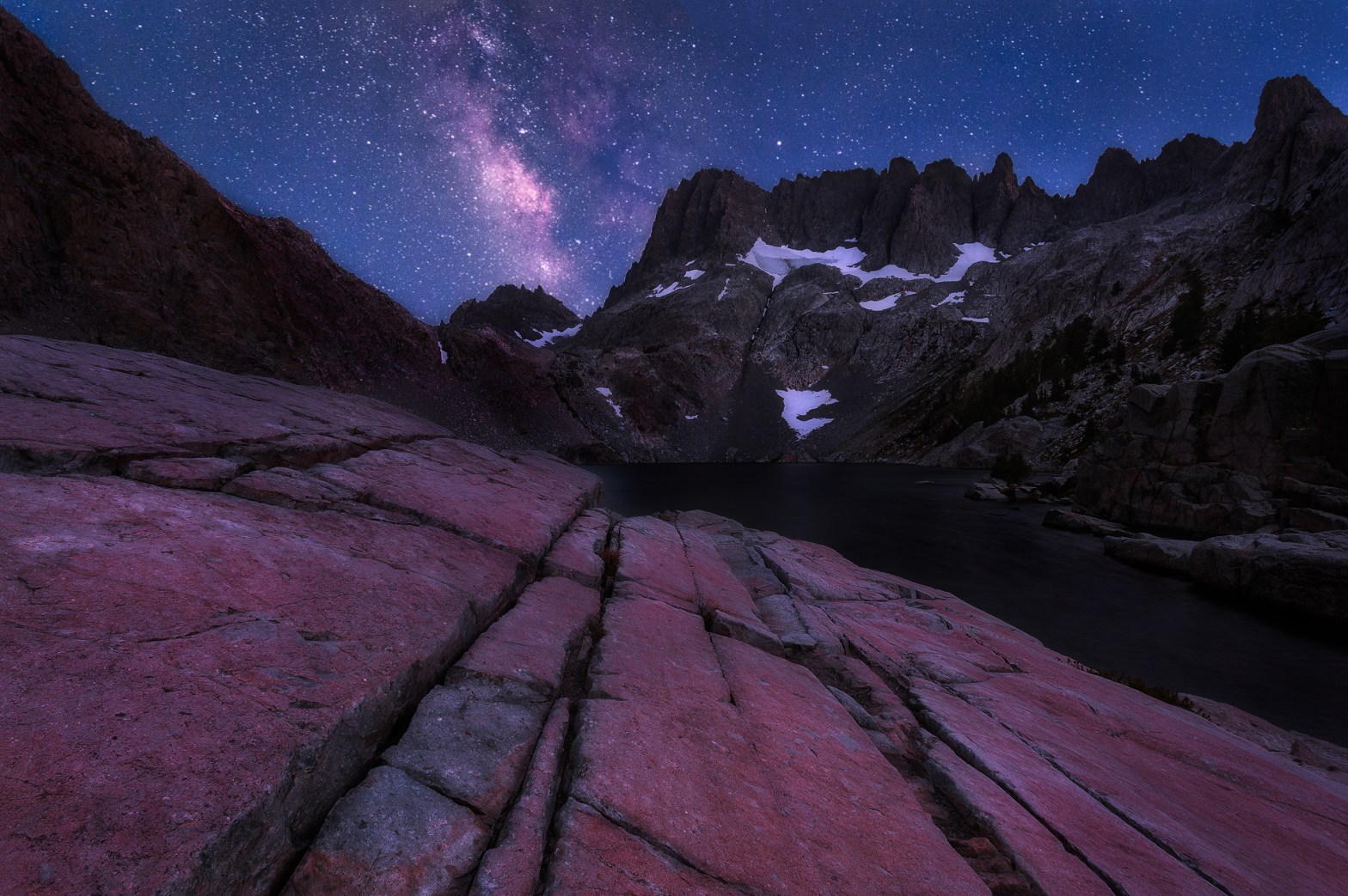 The Milky Way galaxy shines in the night sky above the jagged Minarets, as seen from the fractured granite bedrock at Iceberg Lake. Ansel Adams Wilderness, California. Prints Available.