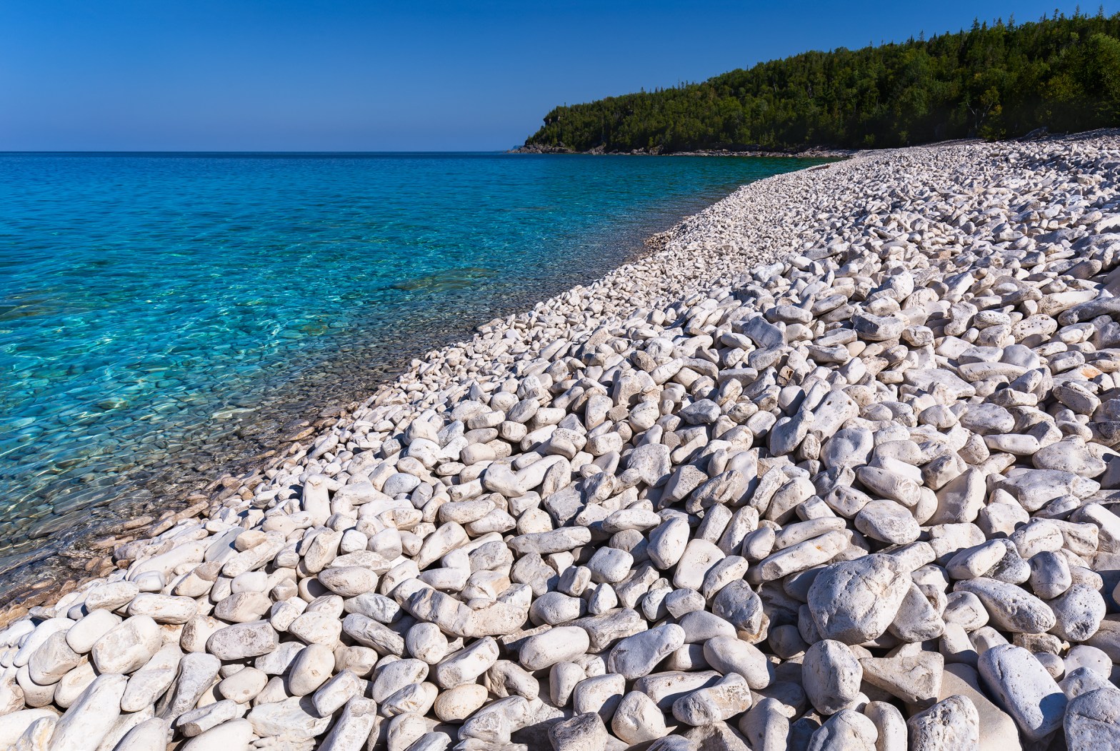 A beautiful beach of white cobblestones lines the turquoise waters of Georgian Bay. The lack of vegetation in the lake here gives the water an unbelievable color and clarity, which can make Georgian Bay seem more Caribbean than Canada. Bruce Peninsula National Park, Ontario. Prints Available.