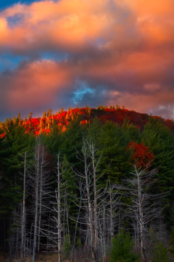 While not one of the tallest or the highest Adirondack High Peaks, Phelps Mountain is my personal favorite Adirondack peak for watching and photographing a winter sunset. Ringing in at a round-trip distance of 8.8 miles with almost 2,000 feet of elevation gain if departing from the Adirondack Loj (parking fee of $15/day, reduced to $7/day for Adirondack Mountain Club members) Phelps is in that sweet spot of providing enough of a challenge to make you feel like you’ve really accomplished something, while being short enough so that you won’t be hiking back in the dark for hours on end. After a quick 2 mile jaunt to Marcy Dam and a little over a mile of gradual climbing along Phelps Brook, a classic steep and rugged Adirondack trail diverges from the Van Hoevenberg Trail to climb 1.2 miles to the summit of Phelps. Two characteristics of Phelps make this peak particularly amenable to winter sunsets. First, although the summit offers expansive views, it’s not completely exposed and hardy evergreen provide protection from the wind and make for interesting photo subjects when they’re caked with snow and ice. Second, Phelps offers wide-open views to the west, meaning that you’ll have a clear vantage point of the sun setting over the lofty summits of Mount Colden and Algonquin Peak, with Mount Marcy catching beautiful sidelight. While views from the summit proper are exceptional, ledges a couple hundred yards shy of the summit might provide an even better vantage point to watch the setting sun cast a warm glow on the snowy landscape
