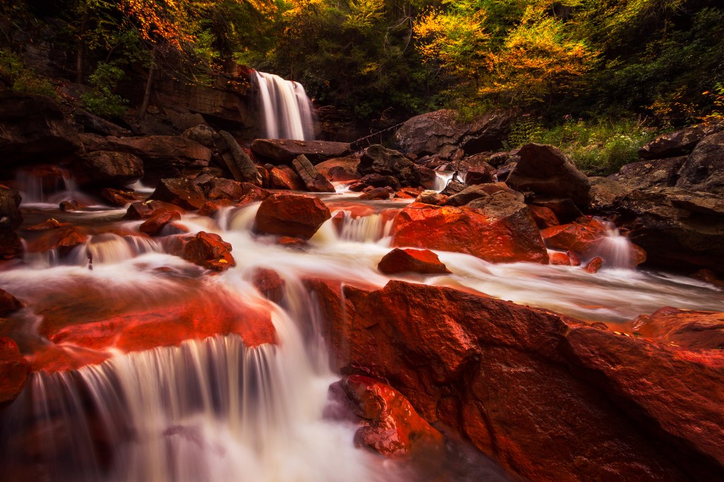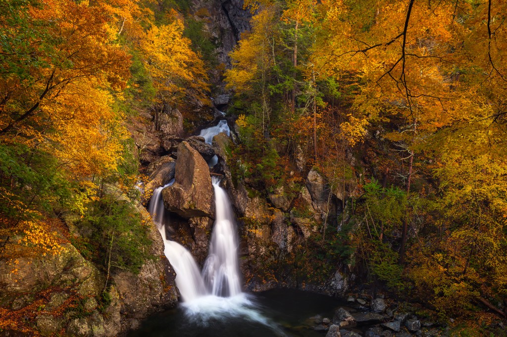 My favorite waterfall photos are often taken while standing right in the water, and this one was no exception. This helps to get the viewer closer to the action, and make them feel as if they’re about to get wet themselves. Once in the shallow water at the edge of the pool, I positioned my tripod just above the surface to further emphasize the plunge pool and the swirls that I hoped would come from a long exposure.