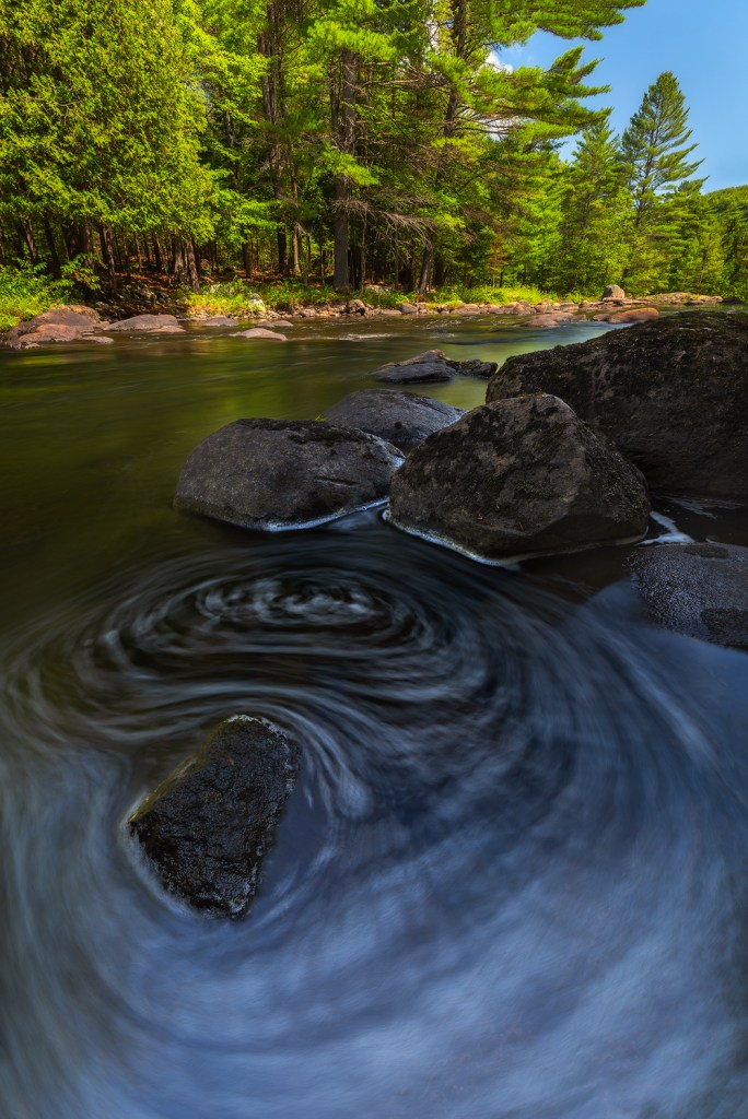 While a 15 second exposure worked great to give the swirl effect, it also rendered the trees in the background as blurry blobs due to the trees swaying from a slight breeze. I wanted the trees in the background to be sharp and in focus, so after taking multi-second exposures for the water I removed the ND filter and left just the circular polarizer on, which allowed a much shorter exposure to freeze the trees, which was combined with the longer exposure foreground shot in post-processing.