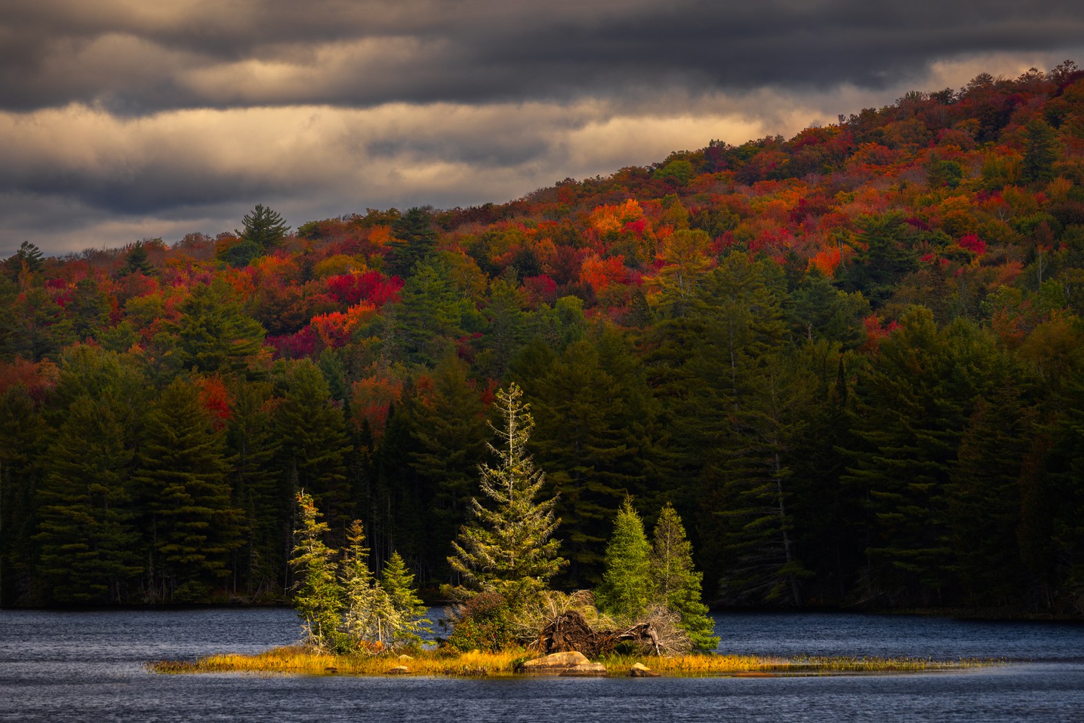 Evening sunlight illuminates a small island in the middle of a lake bordered by bright fall foliage. Adirondack Mountains, New York. Prints Available.