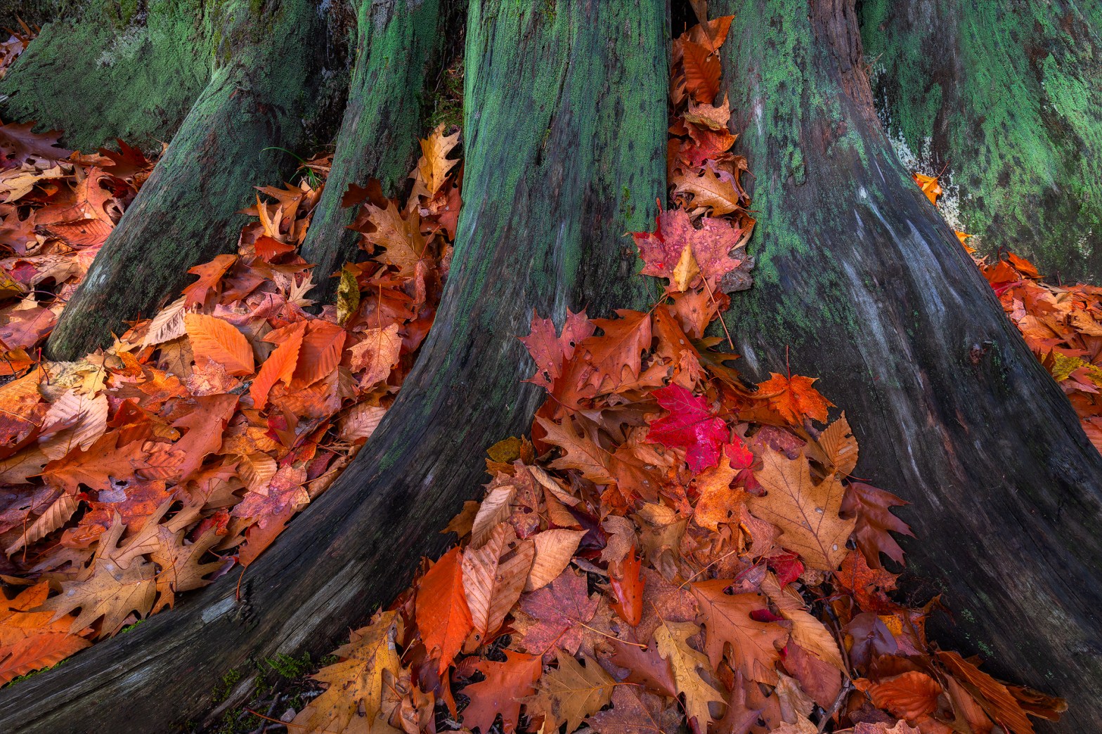 Freshly fallen autumn leaves gather around exposed tree roots in the Adirondack Mountains. Prints Available.