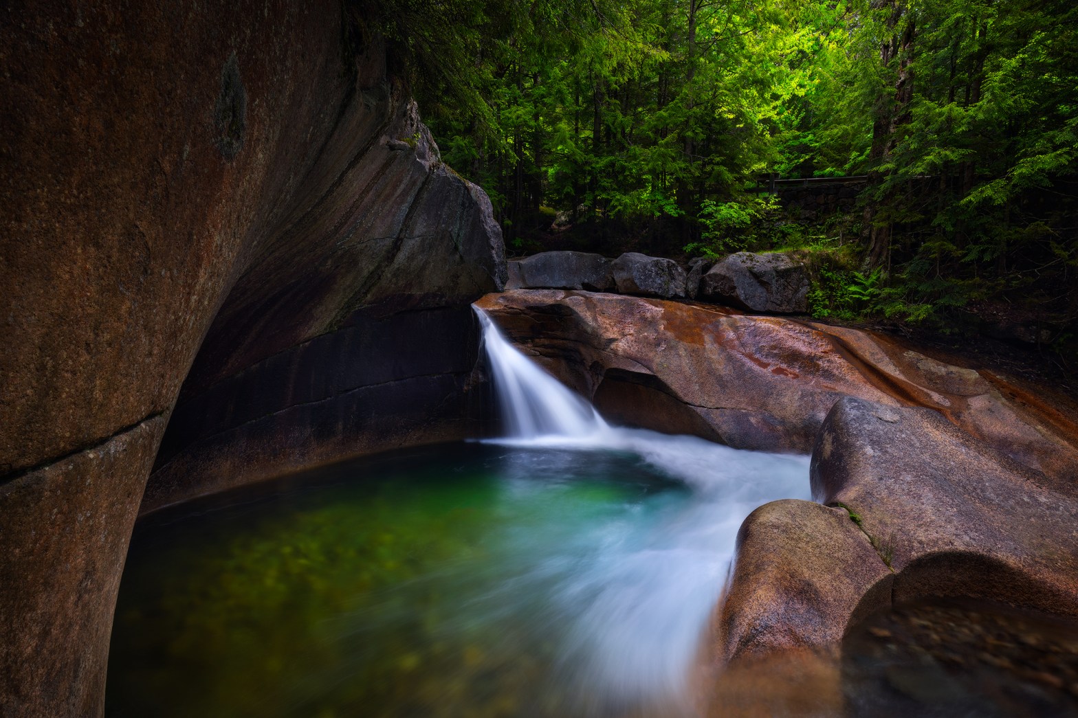 Basin Cascade spills into its beautiful rocky plunge pool on a wet spring day. White Mountains, New Hampshire. Prints Available.