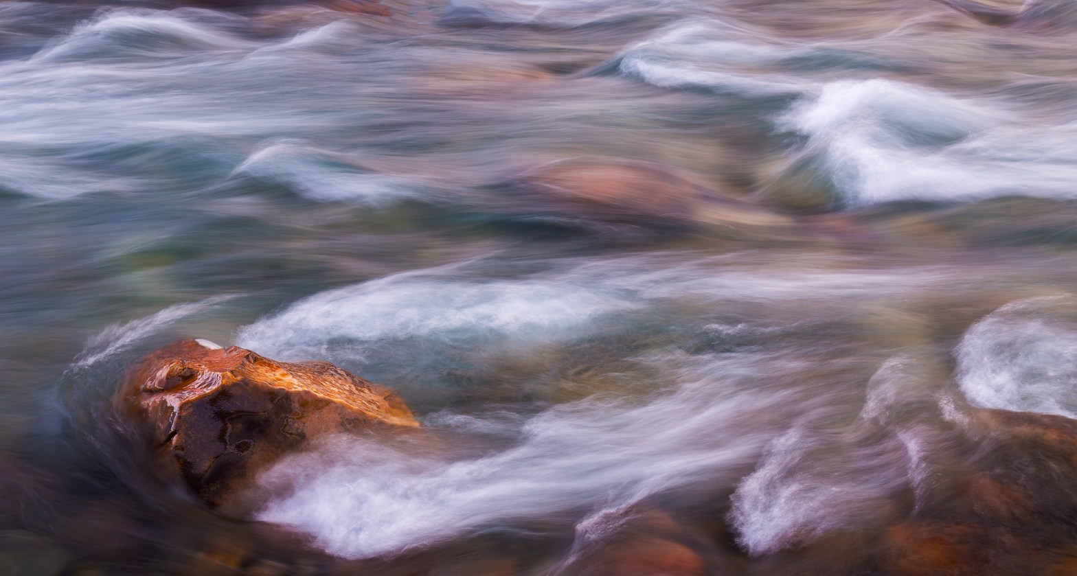 A boulder protrudes from the icy shore of the Athabasca River as winter slowly cedes to spring. Jasper National park, Alberta. Prints Available.