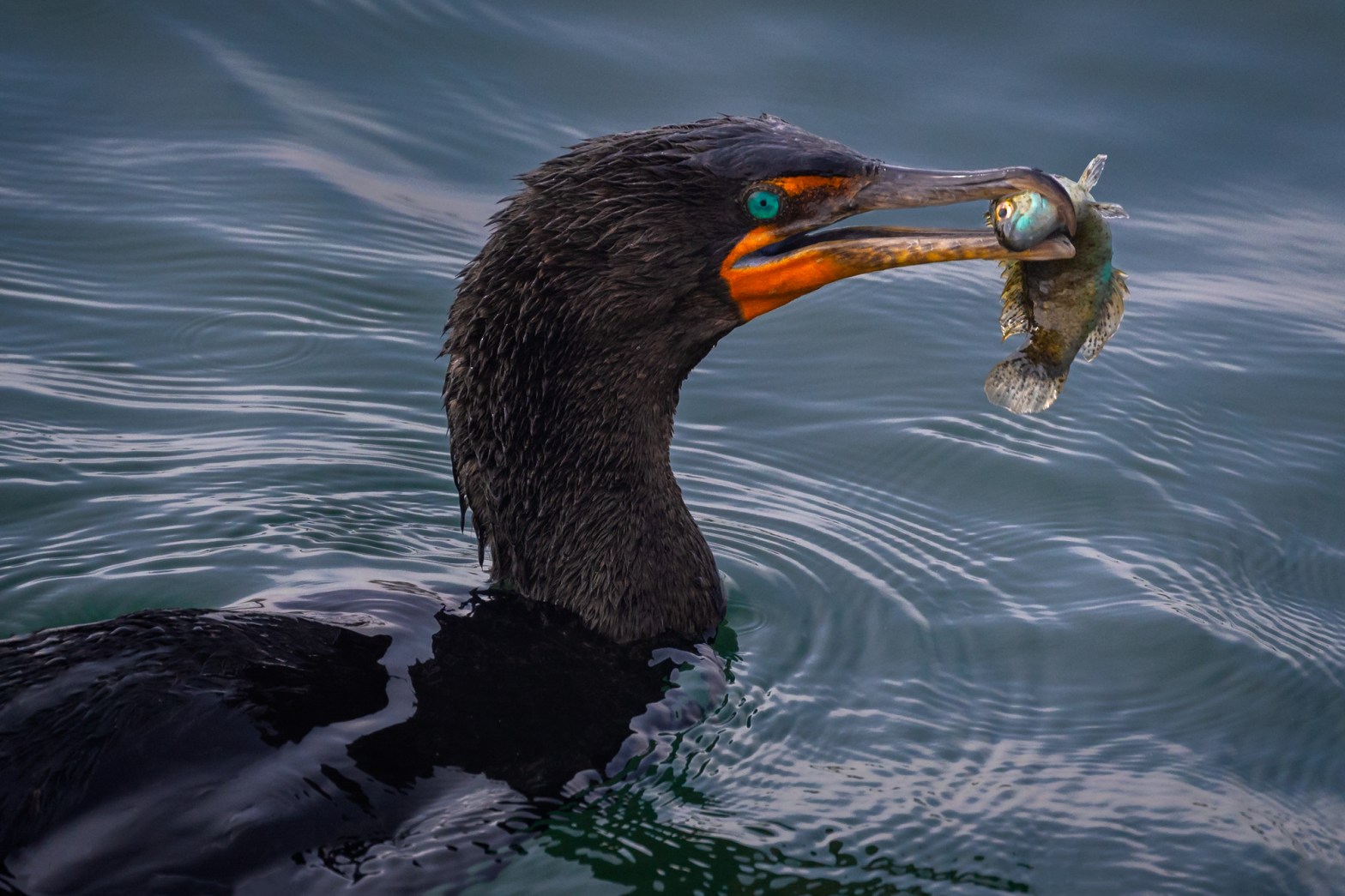 A cormorant comes to the surface with dinner along the coast of Maine. Prints Available.