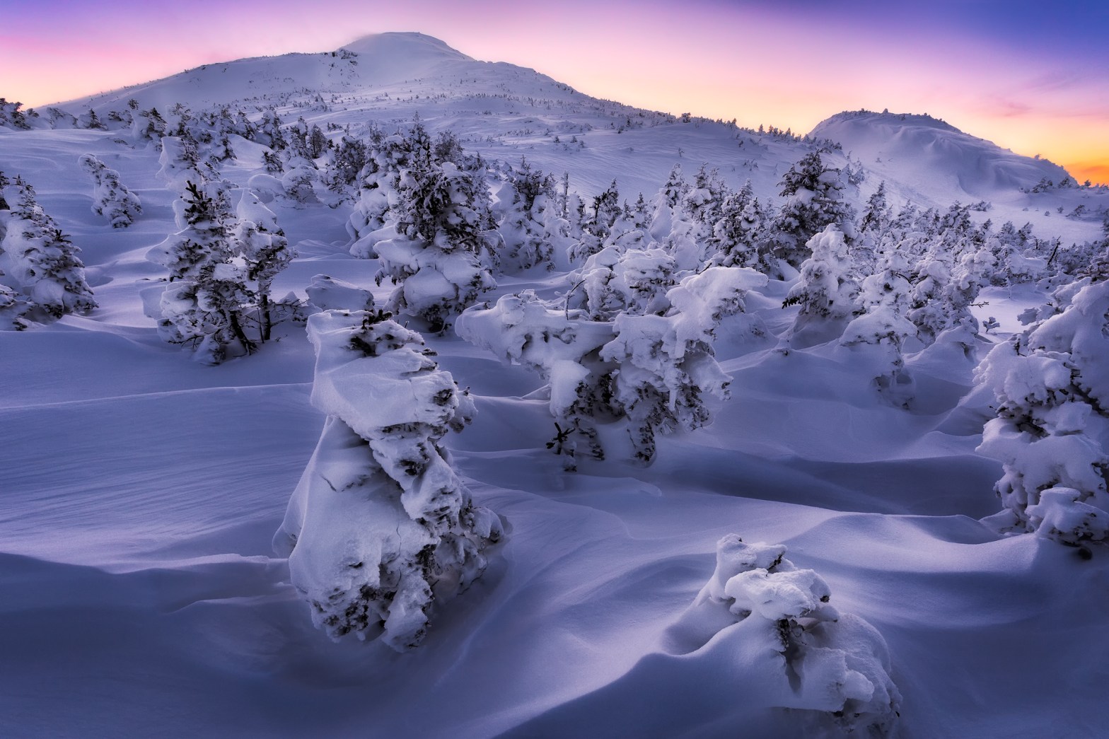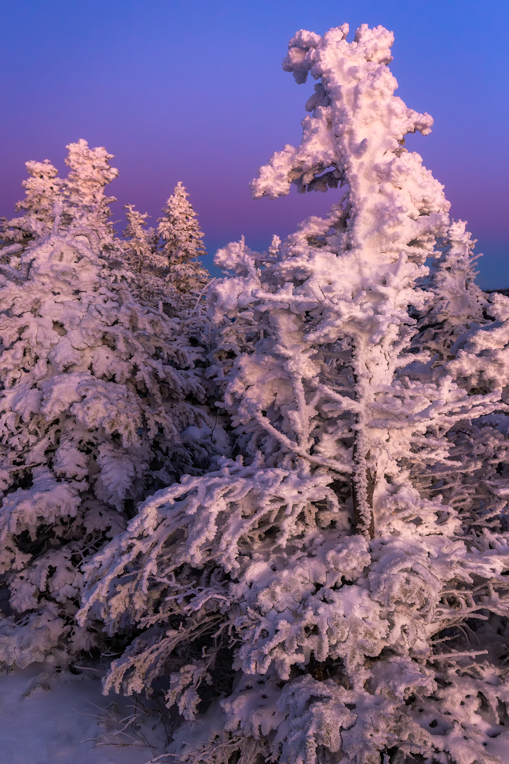 Snowy evergreens on a mountain summit bask in an incredible post-sunset glow. Adirondack High Peaks, New York. Prints Available.