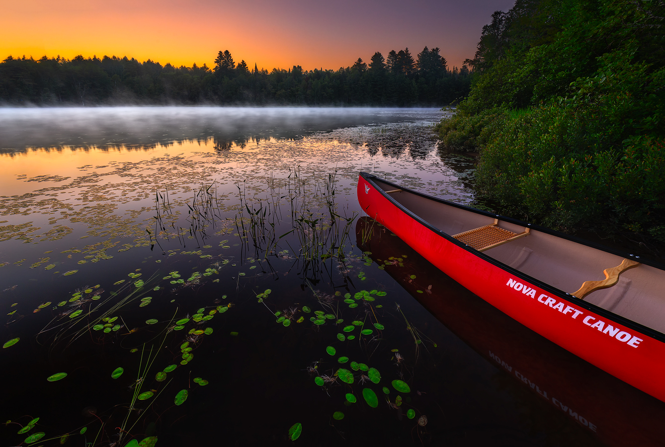 “Bobby” rests on the banks of a peaceful pond at sunrise on a perfect summer morning. Adirondack Mountains, New York. Prints Available.