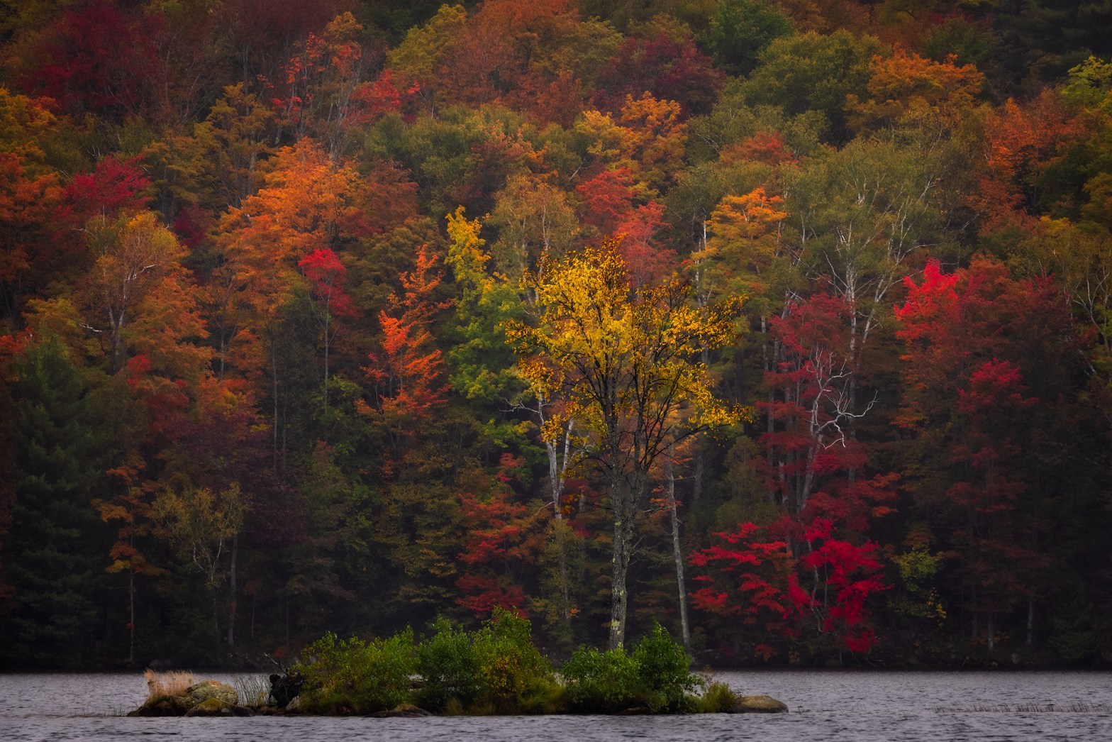Fall colors on a small island and the surrounding hillsides on a misty October day in Vermont. Prints Available.