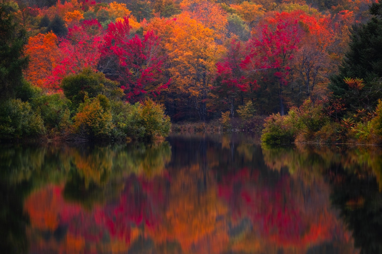 Peak autumn colors reflect in a perfectly calm pond in New Hampshire’s White Mountains. Prints Available.