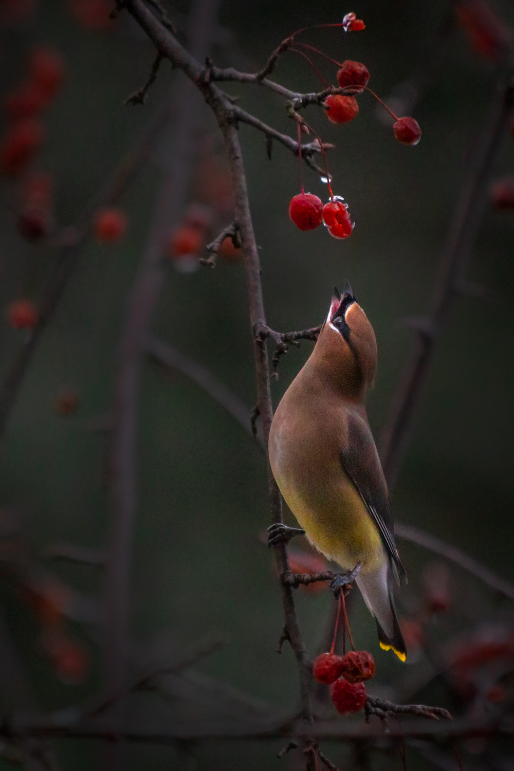 A beautiful cedar waxwing reaches for a berry. Photo taken by Amanda Priola Prints Available.