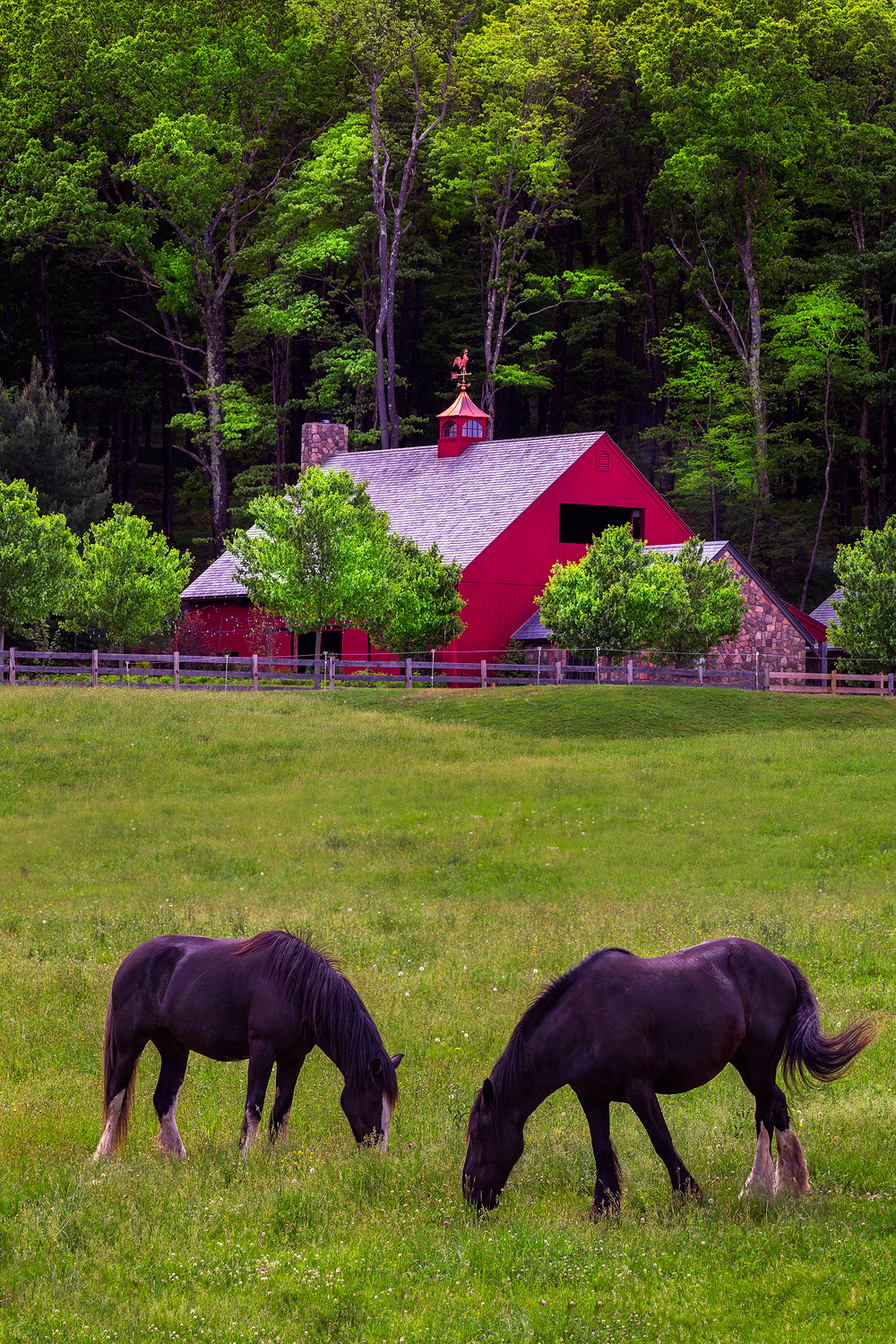 Shire horses graze in a pasture in front of a pretty red barn at June Farms in Upstate New York. Prints Available.