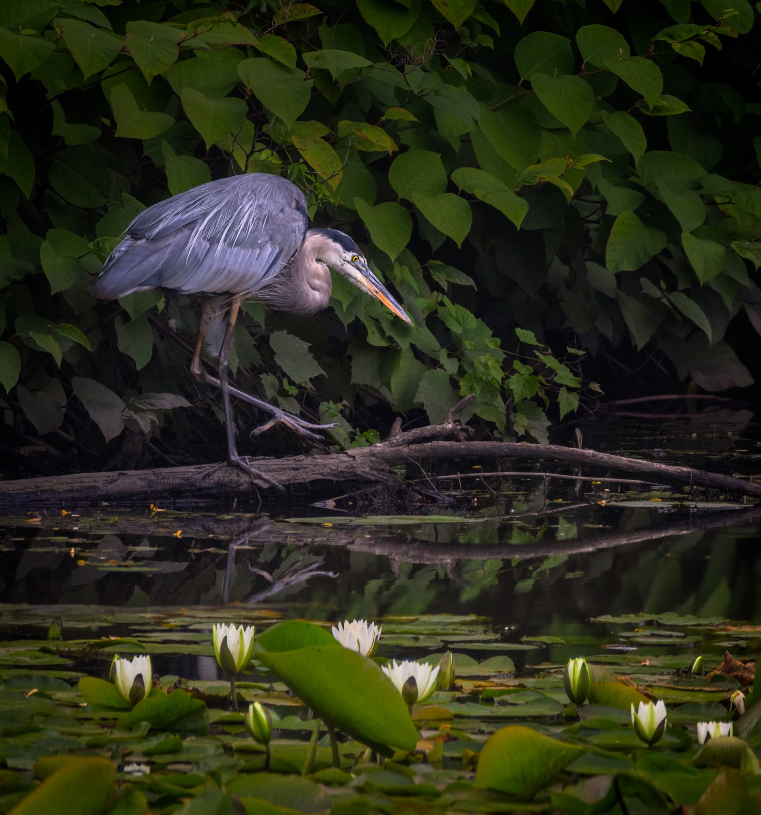 A great blue heron deftly stalks its prey in a pond full of water lilies. I loved how its foot that’s up in the air reflected in the water below. Adirondack Mountains, NY. Prints Available.